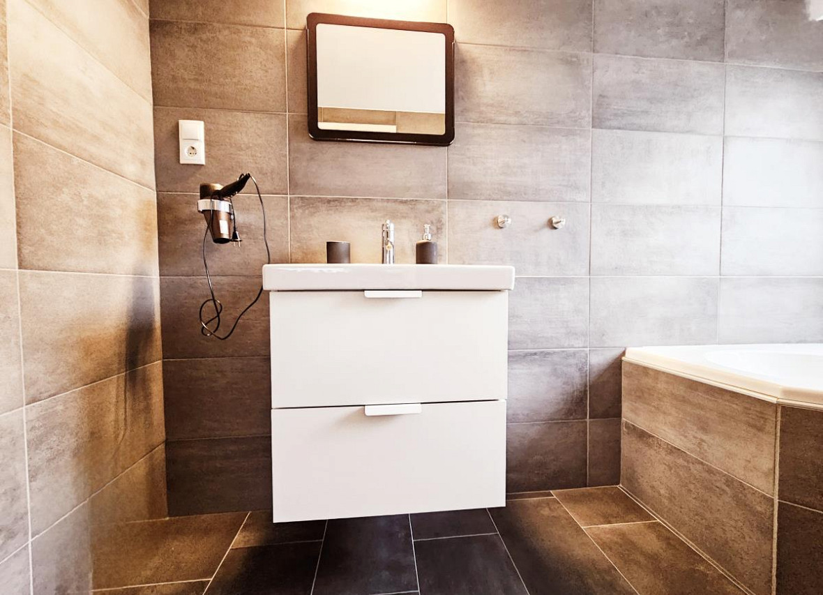 Die Wohnung verfügt über 2 Schlafzimmer. Zum ersten Schlafzimmer gehören zwei Boxspringbetten und ein Badezimmer mit Infrarotsauna und einer Eckdusche. Auch das zweite Schlafzimmer hat zwei Boxspringbetten und ein eigenes Badezimmer. Dieses ist mit Waschbecken und Whirlpool ausgestattet. In beiden Schlafzimmern befinden sich Kleiderschränke. Ein separates WC bietet die nötige Privatsphäre.