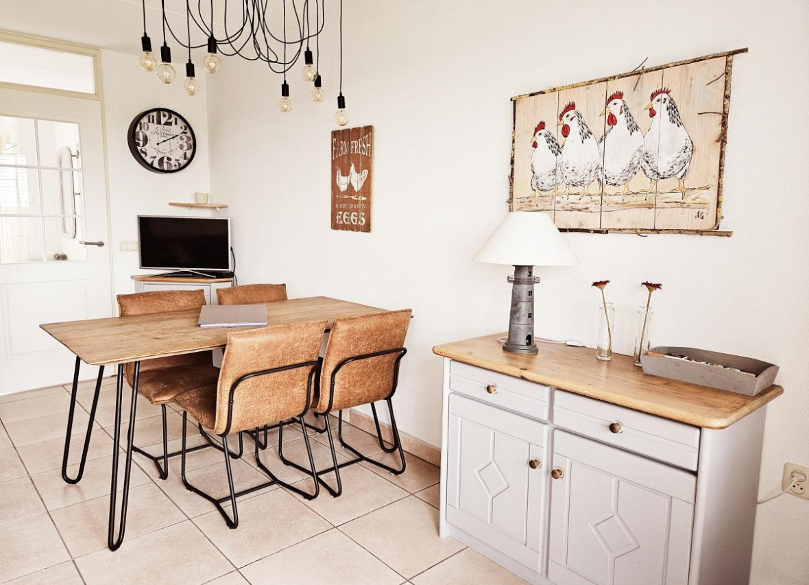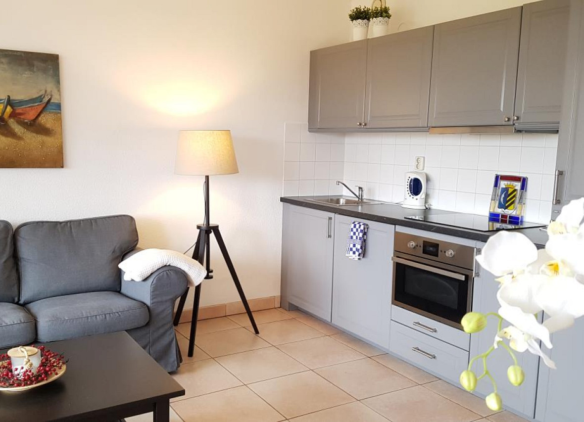Vom gemütlichen Wohn/Essbereich genießen Sie einen freien Blick auf die weitläufige Landschaft, den schönen Garten und Sie genießen den Weitblick in die Natur. Ein großes Sofa sowie 2 bequeme Sessel garantieren Ihnen entspannte Fernsehabende. Wir emfangen deutsche Fernsehprogramme und Ihnen steht während Ihres Aufenthaltes ein Internet-Zugang kostenfrei zur Verfügung. Die Küchenzeile ist harmonisch in den Wohnraum integriert und bietet Ihnen einen Kühlschrank, ein 4-Platten-Ceranfeld, eine Spülmaschine sowie einen kleinen Backofen mit Microwelle.